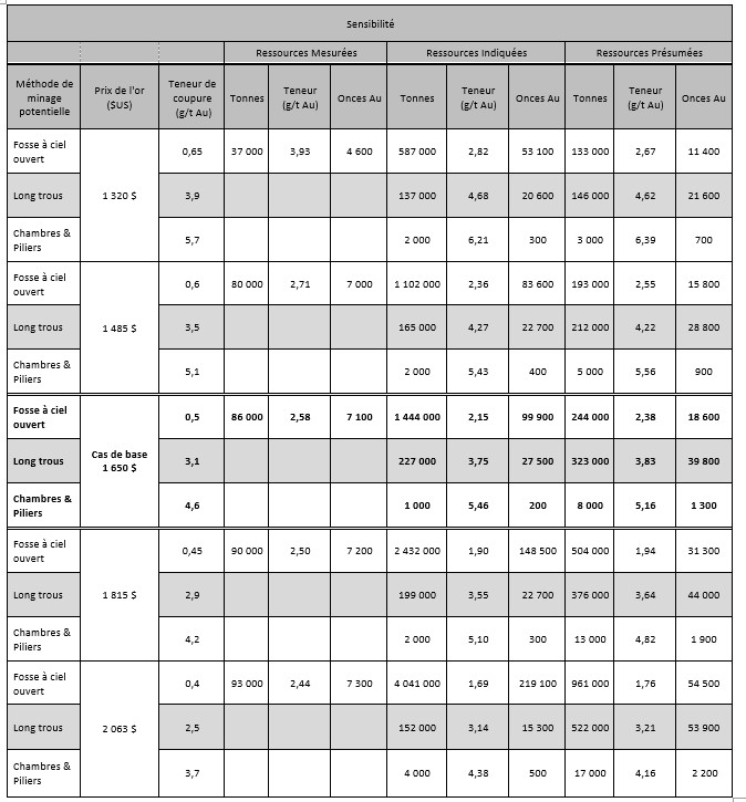 Cette ERM reflète les résultats d’environ 73,4 milliers de mètres de forage, dont 34,9 milliers de mètres ont été effectués depuis 2010 jusqu’en 2020. L’ERM a été réalisée par la firme InnovExplo de Val d’Or. L’ERM utilise un cas de base évalué à un prix de l’or de 1 650 $/oz. Veuillez lire les notes sous le tableau 1 pour la liste complète des critères d’évaluation de l’ERM.