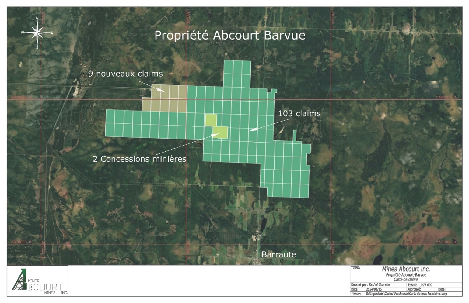 Rouyn-Noranda, Canada, April 16, 2024–Abcourt Mines Inc. (“Abcourt” or “the Company”) (TSX Venture : ABI) is pleased to announce that it has obtained by map designation on April 14, 2024, nine (9) claims contiguous to its Abcourt-Barvue Property, located in the Barraute area, in Abitibi-Témiscamingue. The Abcourt-Barvue Property consists of two mining leases and 103 designated cells for a total of 5,123.4 hectares. Abcourt owns 100% of the Property, which is free of any royalty.