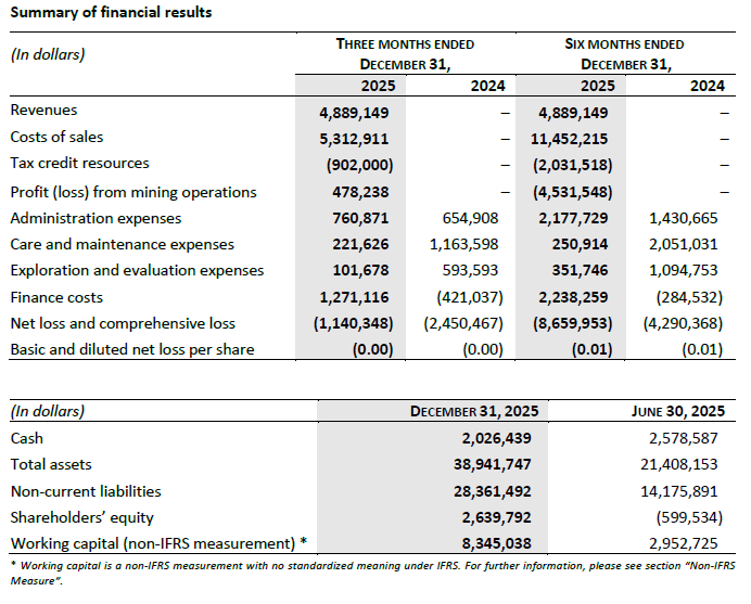 Pascal Hamelin, President and CEO of Abcourt Mines, stated: ” The continued development of the Sleeping Giant mine is progressing well, as demonstrated by the profit from mining operations generated during the quarter ended December 31, 2025. Various rehabilitation and development projects are ongoing and will increase the production rate in the coming months, paving the way for eventual commercial production.”
