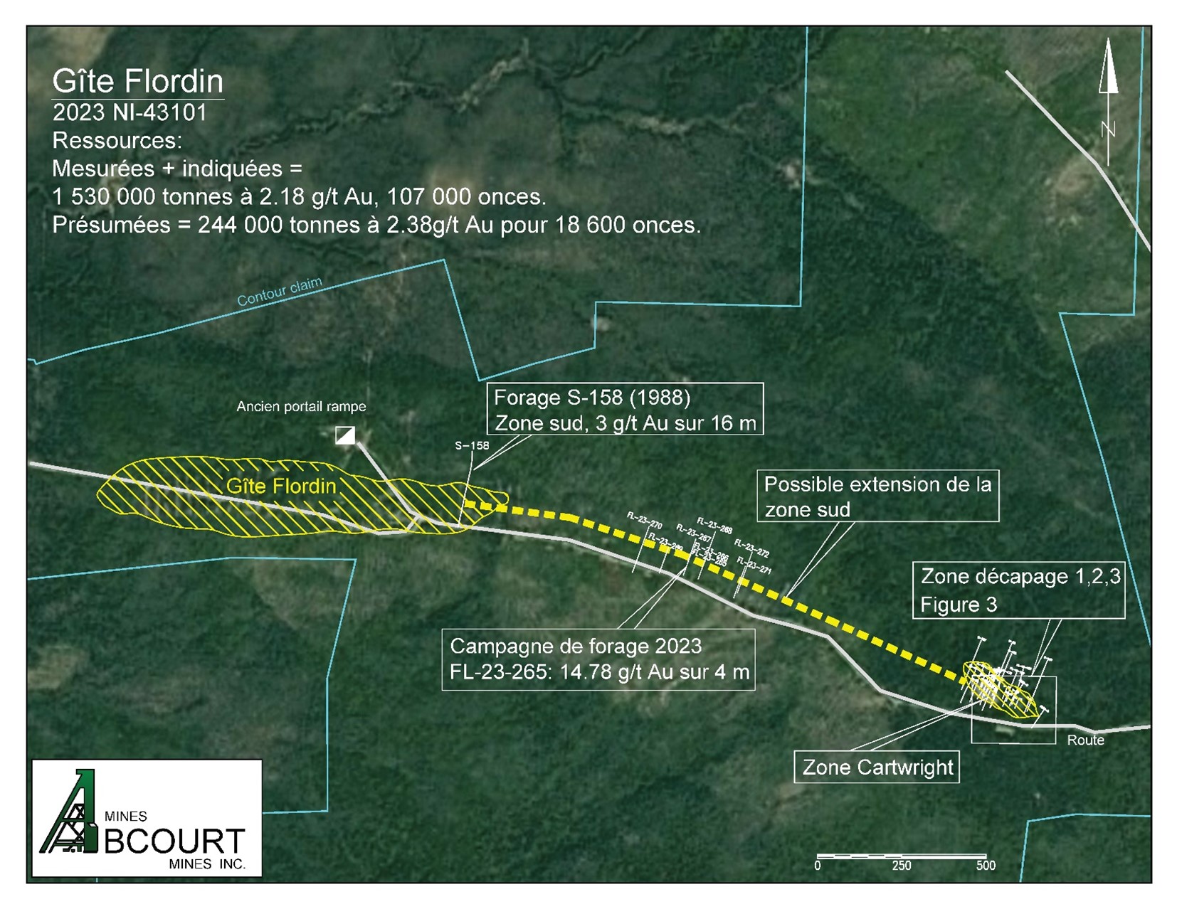 Rouyn-Noranda, Canada, August 21, 2024 –Abcourt Mines Inc. (« Abcourt » or the « Company ») (TSX Venture: ABI) (OTCQB: ABMBF) is pleased to announce its most recent channel sampling results from three mechanical strippings conducted in the vicinity of the Cartwright deposit on the Flordin property. The most significant intersection obtained comes from stripping No. 2, channel No. 6, which is 22.7 g/t gold over 7 metres including 161.9 g/t gold over 0.5 metre. The grooves made, eight in total, are all 0.5 metres long and are connected to each other. Each of the channels averages 6-8 cm deep and intersects perpendicularly with the mineralized zones, which are oriented east-west with a sub-vertical dip. The mineralization is associated with significant shear and is composed of pyrite-rich bands in zones with Gossan-type surface alteration (weathering) (pyrite dissolution, yellow surface).