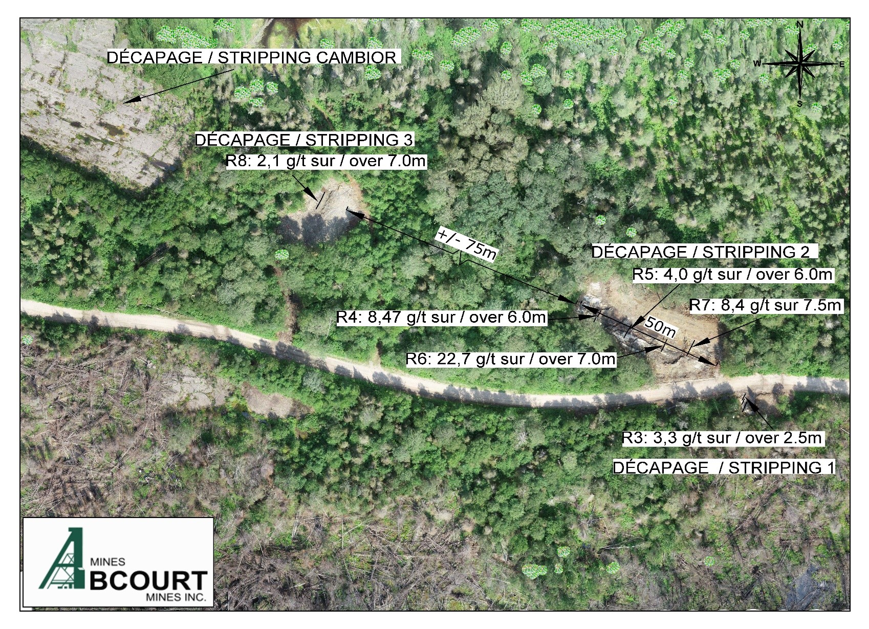 Abcourt is now applying to the Ministère des Ressources naturelles et des Forêts for an amendment to the authorization to proceed with the complete stripping of the mineralized zone located between the former Cambior stripping and Stripping No. 2. This stripping will expose the high-grade gold mineralized zone over more than 200 metres and will also allow channel sampling of the newly exposed mineralized zone.