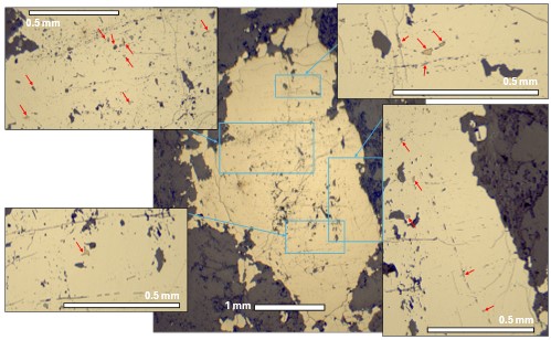 Figure 5: Sub-automorphic pyrite with a core rich in silicate inclusions. Note the presence of numerous gold grains in the pyrite, some of which are associated with fractures that are now sealed. The red arrows indicate the position of the gold grains