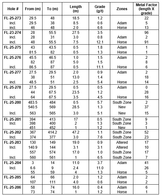Objective 1: Confirm the continuity of gold mineralization directly below the Cartwright stripping completed in the fall of 2024.  A total of nine (9) short holes for a total of 1227 metres were drilled in the Cartwright area.  All the 2025 drillings carried out under stripping returned gold values over tens of metres in length.  Hole FL-25-274 returned 3.5 g/t gold over 27.5 metres, including 12.1 g/t over 7.5 metres.  Making this intersection one of the richest in gold in the project.