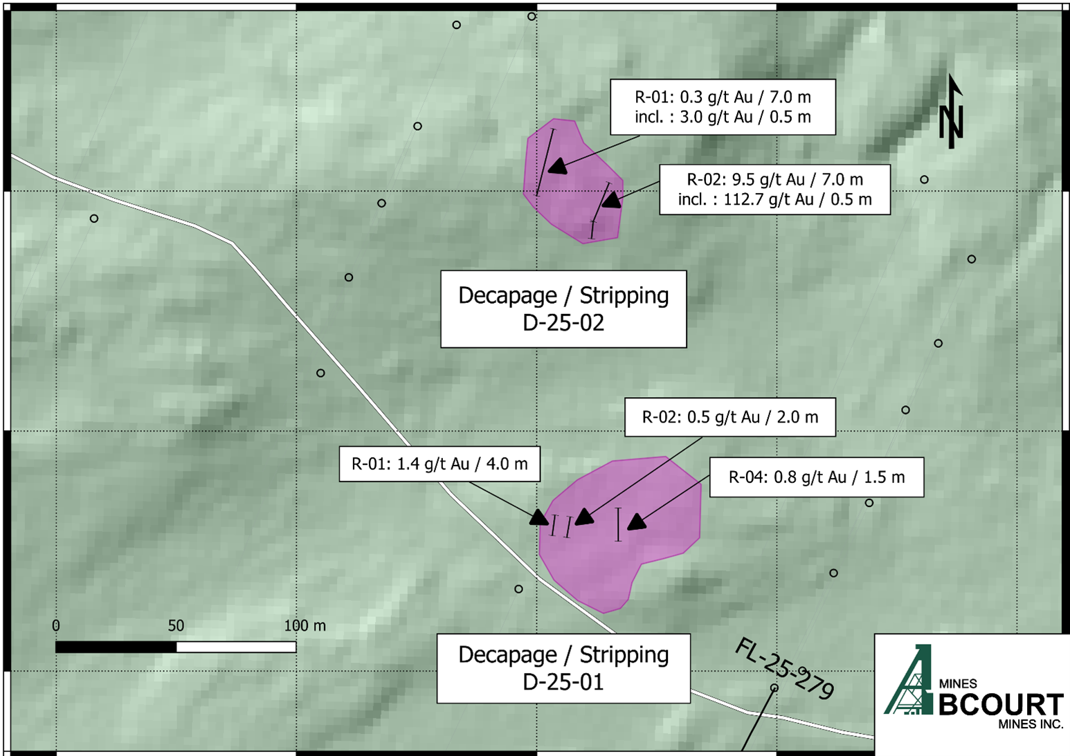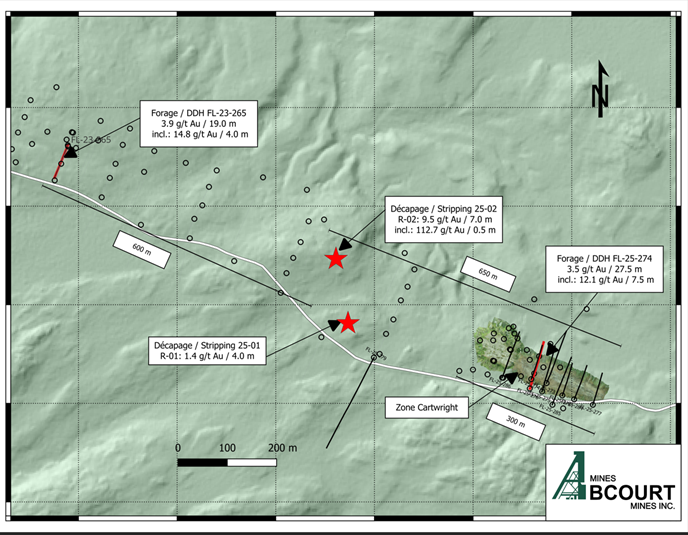 Rouyn-Noranda, Canada, September 25, 2025 – Abcourt Mines Inc. (“Abcourt” or the “Company”) (TSX Venture: ABI) (OTCQB: ABMBF) is pleased to announce its most recent results from the Flordin Cartwright project where two new strippings were completed. These have extended the current mineralized zone to more than 650 metres while identifying new mineralized zones parallel to previously identified zones that had never been exposed or drilled at depth.