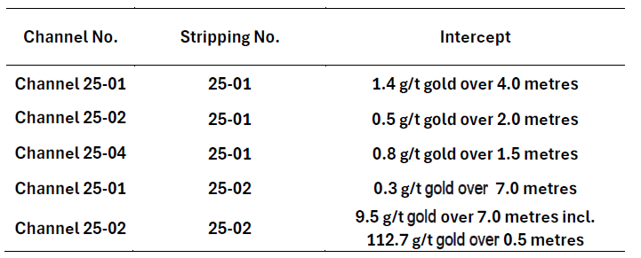 Stripping 25-01 presents mineralization parallel to the historic Adam, Horse and Little Joe zones, further north, while being located close to the main access road. This new mineralized zone, which had never been drilled or sampled, identified a gold grade of 1.4 g/t Au over 4.0 metres in Channel No. 1 while remaining open in both directions. The mineralization remains traceable from channel to channel and therefore demonstrates lateral continuity. The new mineralized zone is more silicified than known historical showings; also hematization, which is characteristic of the mineralized zones of the Cartwright area, is absent.