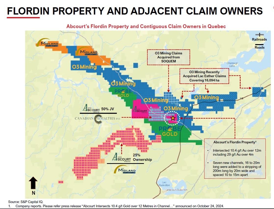 Pascal Hamelin, President and CEO comments: “The latest drilling results from the Cartwright stripping demonstrate the continuity of the Horse and Adam mineralized zones within a broad corridor of disseminated pyrites in basalt over 200 metres along strike.  To date, we have completed only 804 metres of drilling directly under the trench.  Planning is currently underway to add additional holes in this area that remains virtually unexplored to the east.  Indeed, hole 277 is the only one that has been completed in this area.  With a gold price approaching $3,000 per US ounce, the Flordin project, with convincing results so close to surface, remains a priority for Abcourt.  Finally, we would like to welcome Agnico-Eagle to our Flordin-Cartwright sector.  Last December, Agnico-Eagle announced the acquisition of O3 Mining, which holds mining titles and carries out exploration work in this area.”