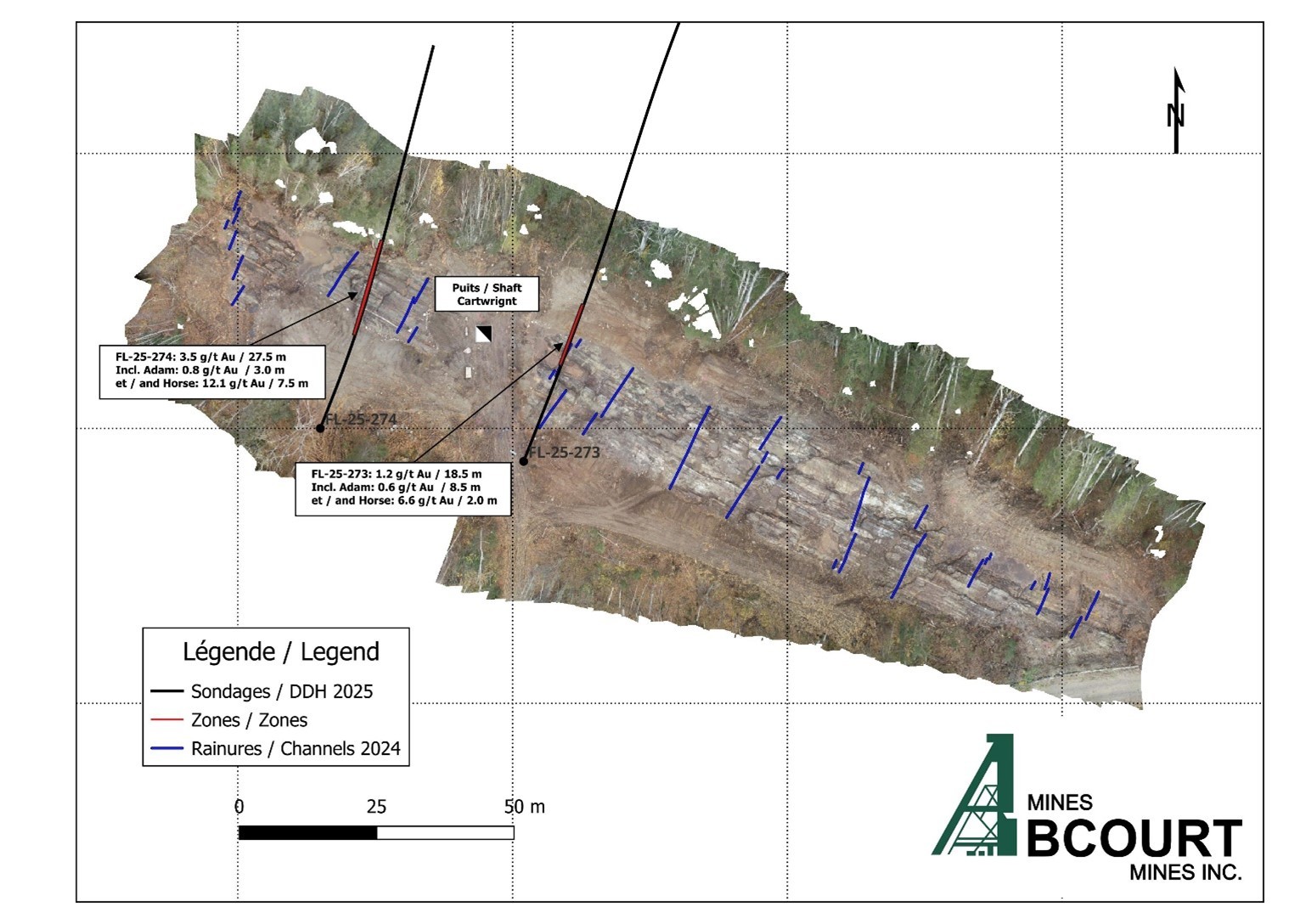 All the drill holes intersected the mineralized zones recognized in the October stripping, namely the Adam and Horse zones.  Between the zones, there is the presence of lower-grade gold directly related to disseminated pyrites.  We are able to obtain interesting gold grades near the surface over several ten meters of thickness for all the drilling carried out under the trench. Indeed, drill holes FL-25-277 and FL-25-278 respectively intersected 1.4 g/t gold over 13 metres and 1.2 g/t gold over 23.5 metres.  Other drill holes will be added in the Cartwright sector, as soon as the drill has completed those in the South zone in a few weeks (approximately 2,500 metres).