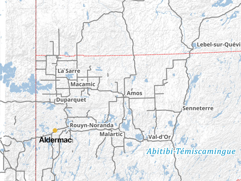 Abcourt holds 100% of the Aldermac property located in Beauchastel township near Rouyn-Noranda, Quebec. This 303- hectare property is the site of a former mine, serviced by a 495-meter 3-compartment shaft and nine levels. In the past, it produced two million tons of ore with a grade of 1.78% Cu, 0.2 oz/t Ag, 0.02 oz/t Au and 1.50% ± Zn.