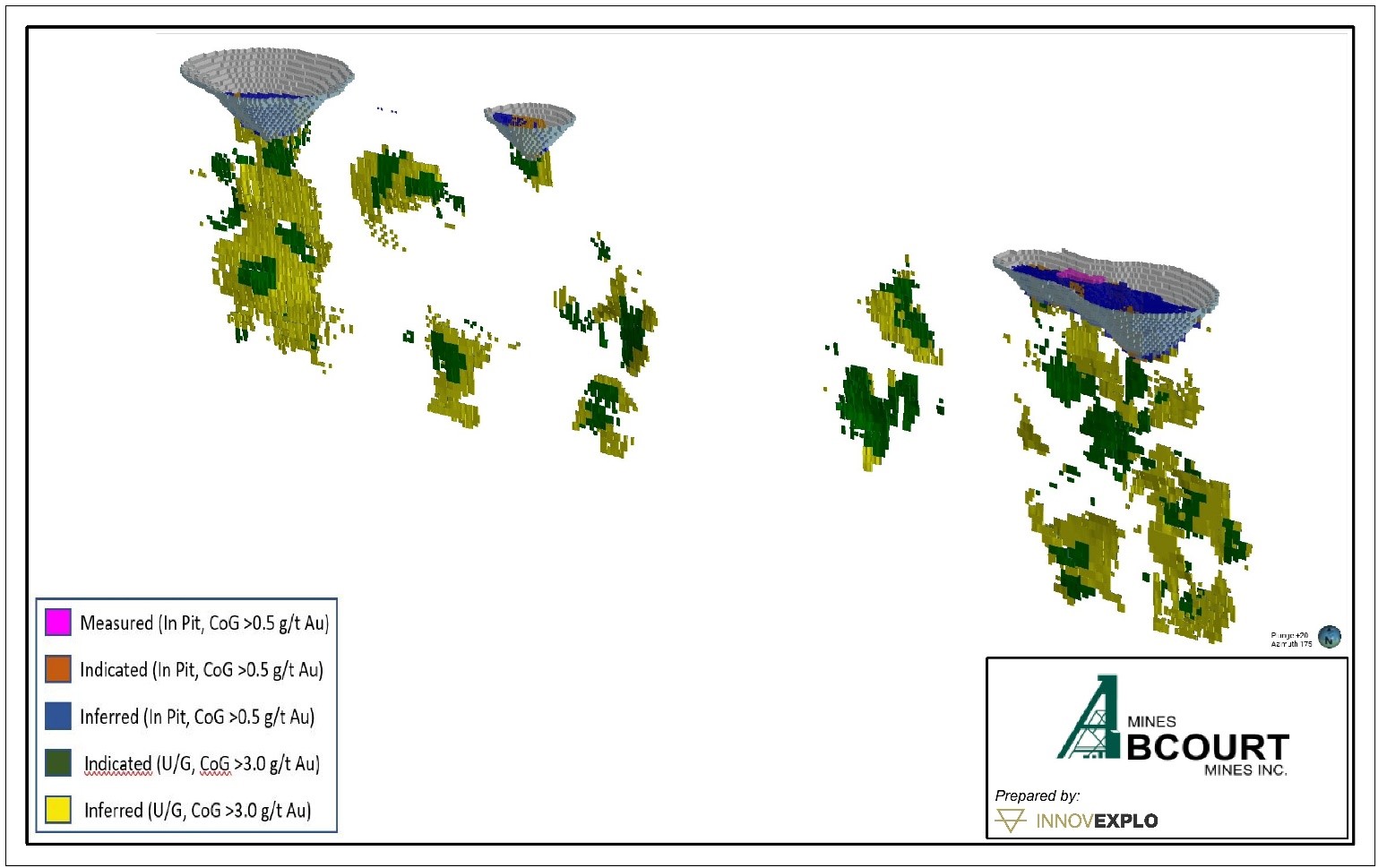 - The Underground 2023 MRE is locally constrained within Deswik Stope Optimizer shapes using a minimal mining width of 1.7 m for a potential Long-Hole underground mining method (potential block of 16m X 16m), with no maximum width. It is reported at a rounded cut-off grade of 3 g/t Au using the long-hole mining method. The open pit 2023 MRE is locally constrained within Whittle surfaces using a rounded cut-off grade of 0.5 g/t Au. The cut-off grades were calculated using the following parameters: mining cost Open Pit = C$4.65/t; mining cost Underground= C$169.50/t; processing cost = C$21.50/t; G&A = C$12.00/t; selling costs = C$5.00/oz; gold price = US$1,650.00/oz; USD:CAD exchange rate = 1.33; and mill recovery = 96.0%. The cut-off grades should be re-evaluated considering future prevailing market conditions (metal prices, exchange rates, mining costs etc.).