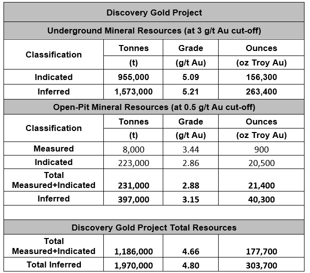 Table 1: Mineral Resources Estimate of the Discovery Gold Project