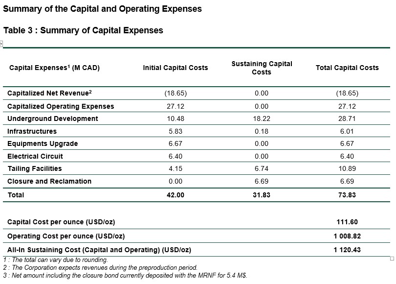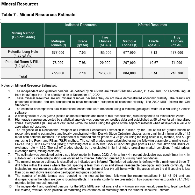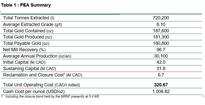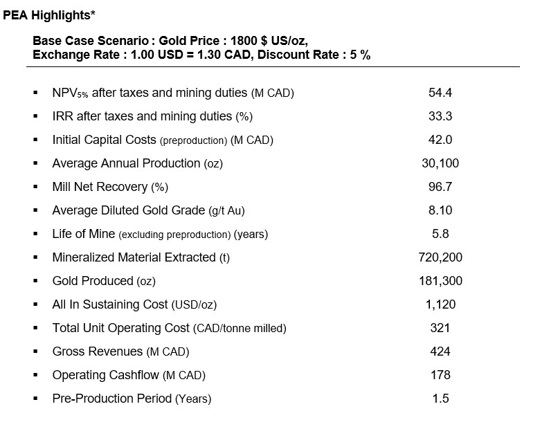 Pascal Hamelin, President and CEO, comments: “The PEA results released today are excellent with an NPV5% of 54 M CAD and an IRR of 33%. The results of the PEA are based on a mineral resource produced in accordance with current CIM standards and guidelines. The PEA envisions a rapid start-up of operations with minimal initial investment. This project could quickly become the next gold producer in Quebec. Targeted drilling towards areas with inferred mineral resources could potentially increase resources and some project economics. The PEA is considering 50% utilization of our ore processing plant. This new drilling could potentially increase feed capacity and operate the plant at full capacity. This capacity could also allow us to accept material from other deposits such as Discovery and Flordin in the medium term, and potentially increase the value of our assets. The next step is to now target promising areas to convert inferred to indicated resources for incorporation into a more detailed economic assessment. With the potential to add other deposits to the project, we anticipate strong economic potential for the region around the Sleeping Giant plant in the future. »