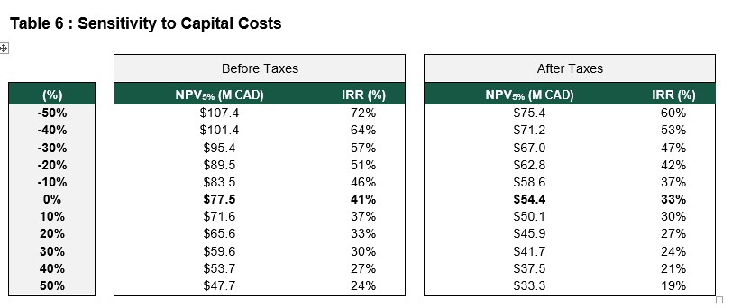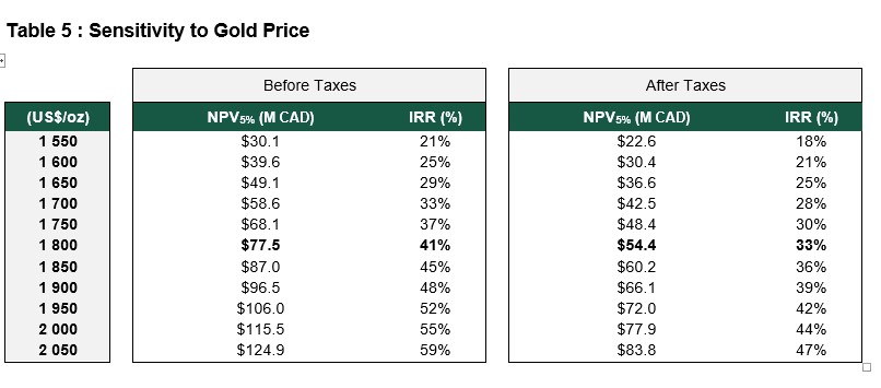 A sensitivity analysis was performed to validate the impact on NPV5% and IRR, before and after tax by varying the gold price and capital costs. The results of the analysis are shown in Tables 5 and 6 below; the base case is in bold in the tables. Note that a sensitivity analysis was also carried out on revenues and operating costs. The results of this evaluation can be found in the PEA.